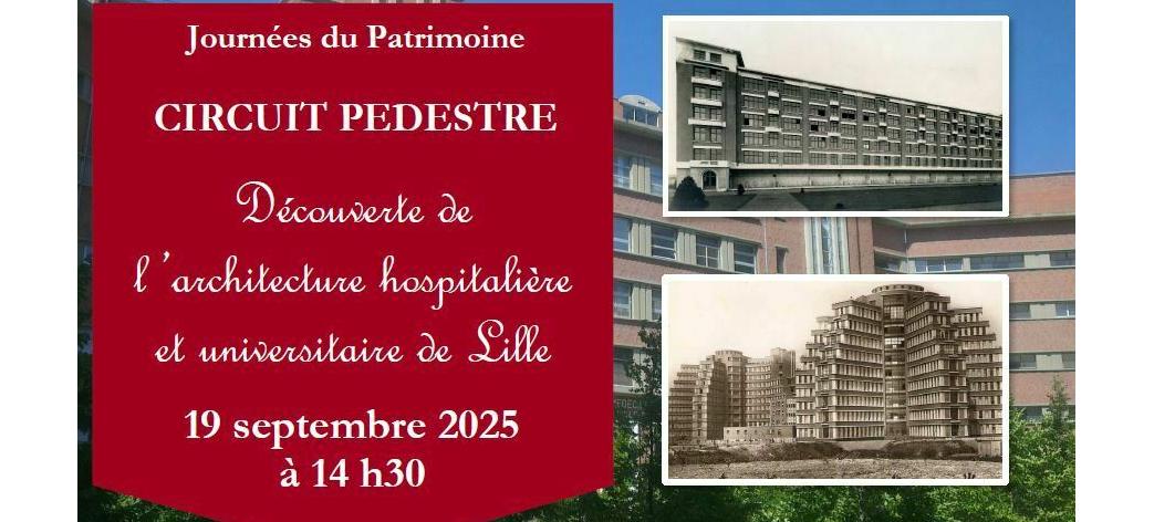 Dans le cadre des Journées Européennes du Patrimoine et des 150 ans de la Faculté de Médecine et de Pharmacie de Lille, l’Association du Musée Hospitalier Régional de Lille vous propose un circuit pédestre "Découverte de l’architecture hospitalière et universitaire " le vendredi 19 septembre 2025 à 14h30.