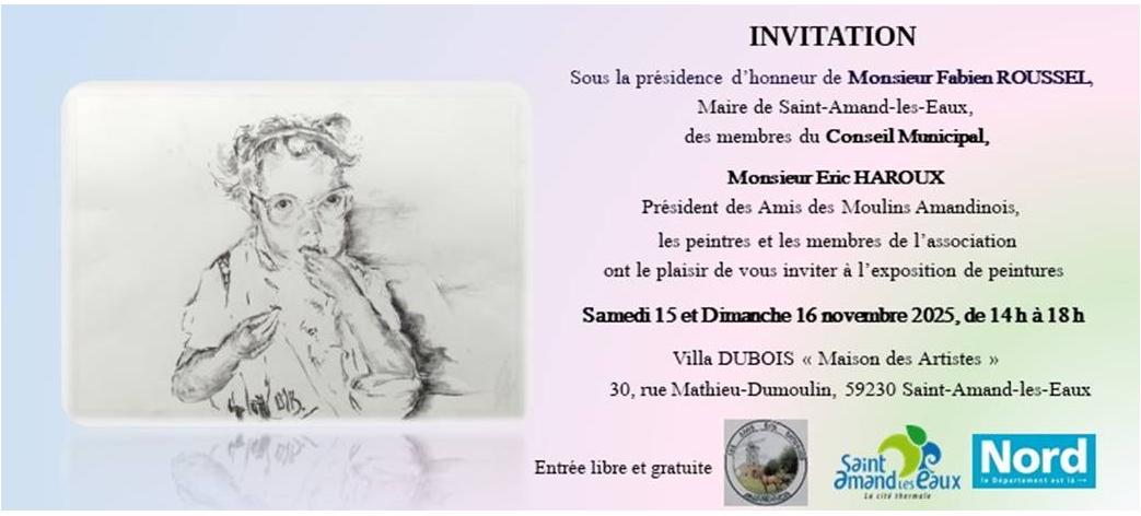 Monsieur Eric HAROUX Président des amis des Moulins Amandinois, les peintres et les membres de l’association ont le plaisir de inviter à l’exposition de peintures.
