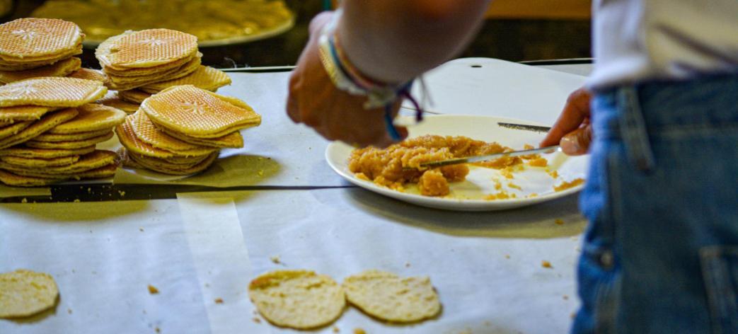 Confection de gaufres fourrées à la cassonade. Les participants élaborent la pâte avec des ingrédients bio, et confectionnent leurs gaufres