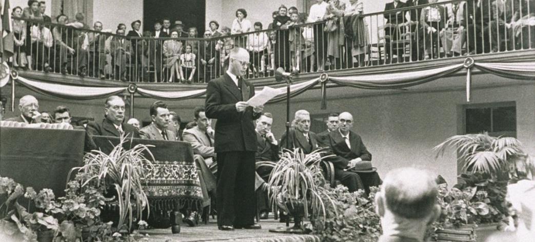Photographie : Discours de l’administrateur-gérant Raymond Anstell à l’occasion de la fête du Travail dans la cour du pavillon central du Palais social. Photographie Roger Foret, vers 1960. Collection Familistère de Guise.