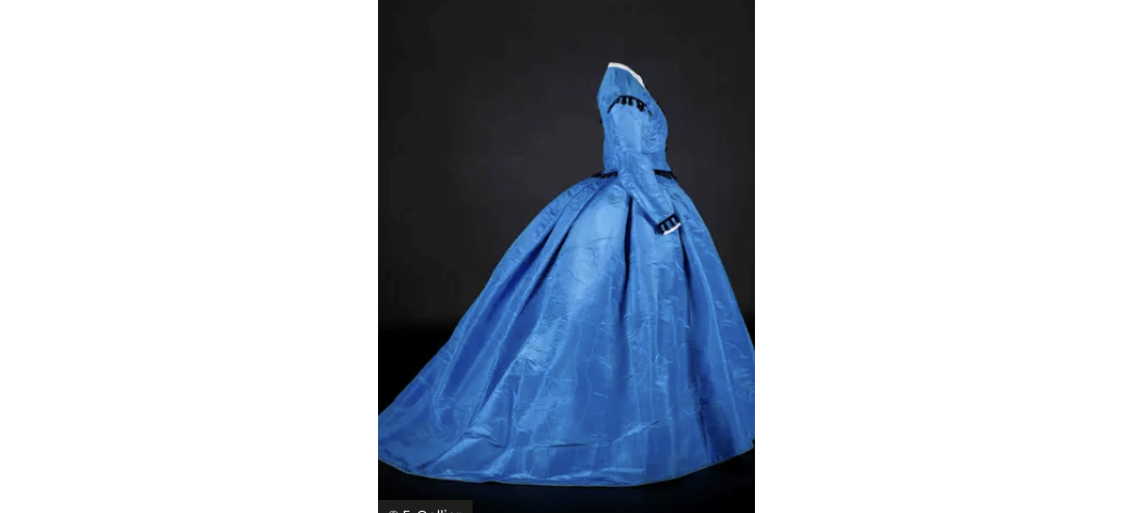 Visuel : Robe à crinoline lancée vers 1865, en gros de Tours jaspé bleu, passementerie, jais et velours, dentelle à l’aiguille type point de gaze_Collection Cité de la dentelle et de la mode de Calais _Photo Fred Collier-Ville de Calais