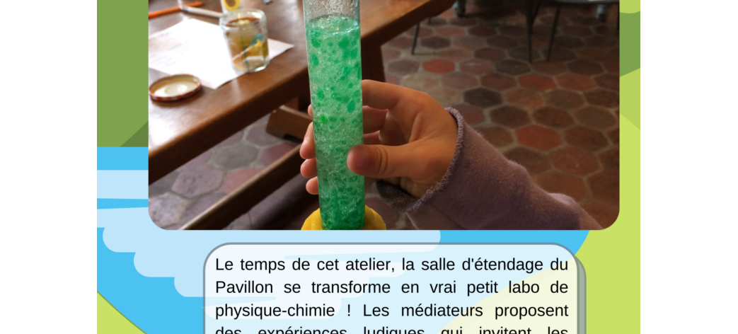 Le temps d’un atelier, la salle d’étendage du Pavillon se transforme en vrai petit labo de physique-chimie ! Les médiateurs proposent des expériences ludiques qui invitent les enfants à manipuler et s’interroger, bref à faire des sciences.300