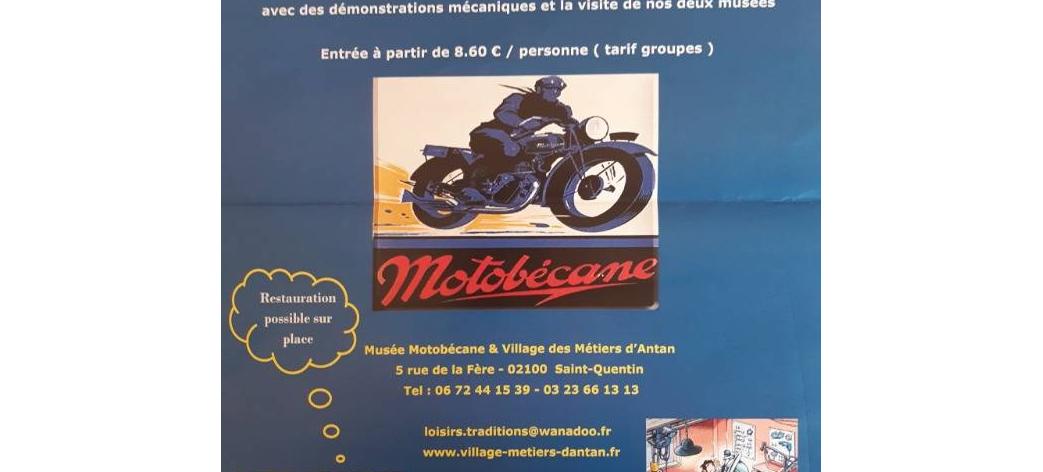 Notre musée MOTOBECANE vous accueillera de 10h00 à 18h00 avec des démonstrations mécaniques, une visite du musée .. vous aurez accés au village des métiers d’ANTAN. sur réservation pour les groupes . Une restauration sur place est prévue sur réservation ( pour les groupes )