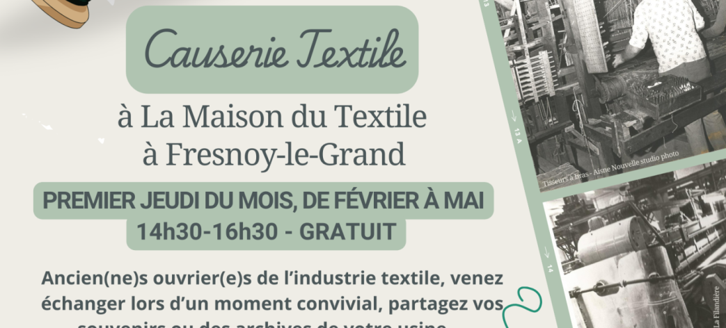 La Maison du Textile organise quatre rencontres appelées « Causerie Textile » au cours de l’année qui ont pour but de collecter des témoignages, des anecdotes, des photos sur différents types d’usines textiles. Nous invitons donc d’anciens ouvriers et ouvrières à venir partager leur expérience lors d’un moment convivial au musée, chaque premier jeudi du mois, de février à mai. Ces rencontres donneront lieu à une restitution.
