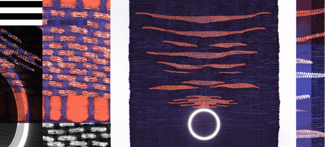 Dès ses premiers tissages, Kenia décide d’y incorporer de la lumière, sous différentes formes. Tissée, brodée ou encore suspendue au milieu des pièces, cette lumière vient traverser les compositions et leur imposer un rythme cali(carto)graphique. Des phares de voitures, de scooters ou de camions donnent à certaines pièces un regard perçant et hypnotisant.
