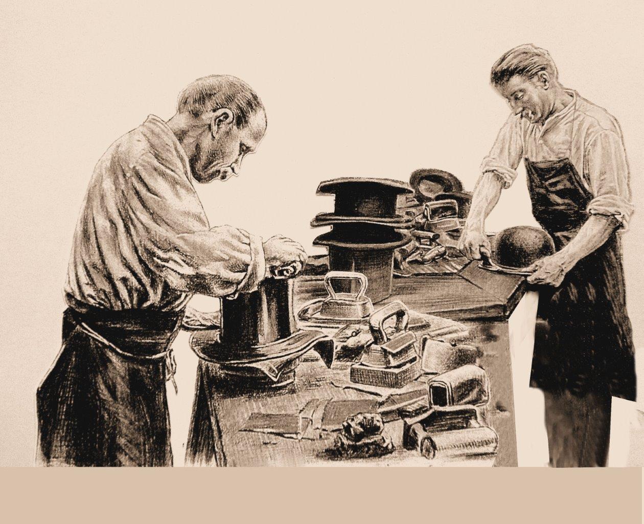 À l’origine, les cônes de feutre, constitués par l’enchevêtrement des poils de lapins, étaient transformés petit à petit après avoir été étirés, moulés sur des formes en tilleul dans une atmosphère chaude et humide produite par de la vapeur.