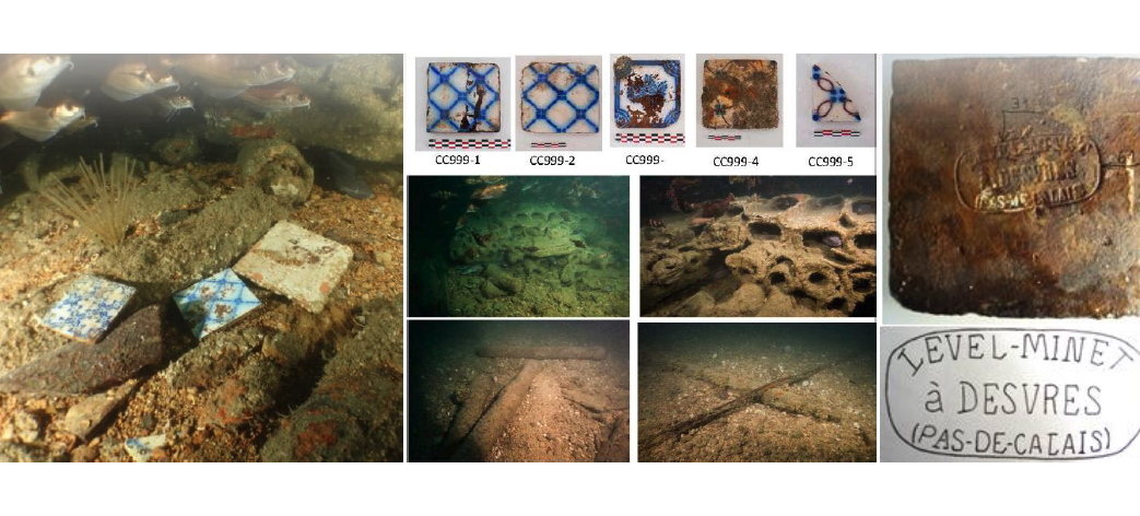 Outre de longs tuyaux de céramique agglomérés par les concrétions, son chargement se compose de carreaux de faïence de Desvres.