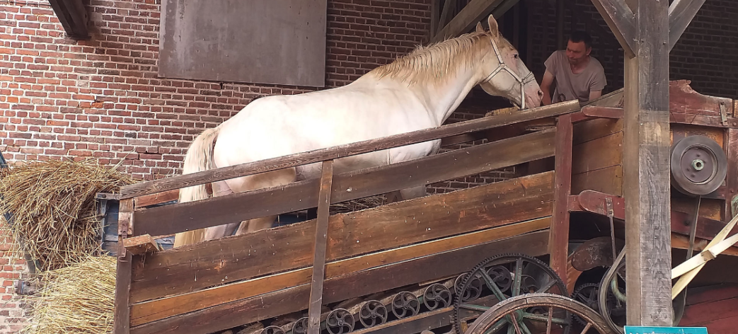 - et le courageux cheval actionne la piétineuse.