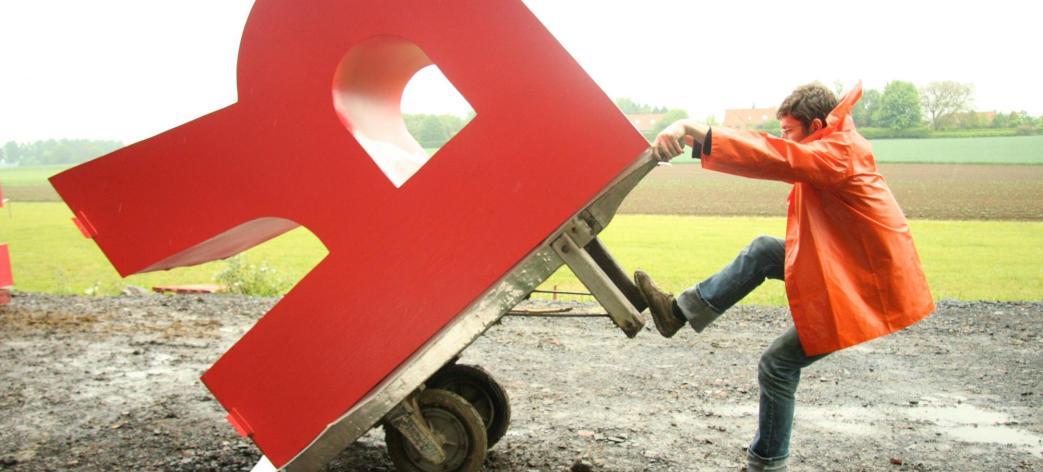 À mi-parcours entre Flandre et Artois, entre Lewarde où elle a été créée pour commémorer le centenaire de la catastrophe de Courrières et son village des lettres d’adoption d’Esquelbecq, l’installation monumentale de Dimitri Vazemsky vient rubriquer le coloris « cerise » des enduits et le feu des tuiles vernissées du coron restauré.