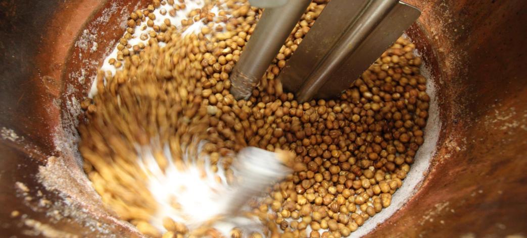 Cette opération consiste à traiter par la chaleur, au contact de l’air, les fèves de cacao pour les déshydrater et développer ainsi toutes leurs qualités aromatiques. Durée et température de torréfaction sont ajustées en permanence selon l’humidité de l’air ou la température ambiante afin de préserver le goût pur du cacao de chaque variété.